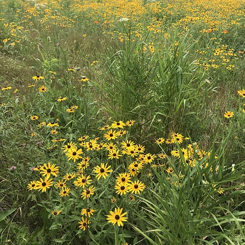 One solution is to plant lots of black-eyed Susans to give you instant gratification for the first year and for the next few years. Then as the older-lived and slower to get going species begin get bigger and start blooming, let them naturally shade out the new black-eyed Susan seedlings and take the place of the original black-eyed Susans as they die out. This is a tactic that is often done in large pollinator plantings and is why a field that was all black-eyed Susans the first year it was planted may have very few black-eyed Susans left by year 5. You can use the same principle on a smaller scale in your garden.