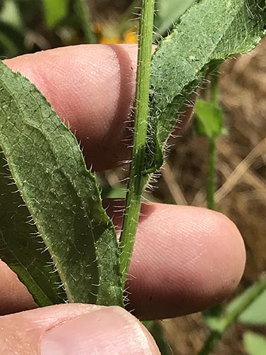 Black-eyed Susan has simple, unlobed leaves that are arranged in an alternate pattern along the stem. The leaves and stems are rough with stiff, bristly “hairs.” In fact, the “hirta” part of Rudbeckia hirta is derived from the Latin word for hairy. The flower has bright yellow petal-like structures that surround a dark brown, flattened cone-like center.