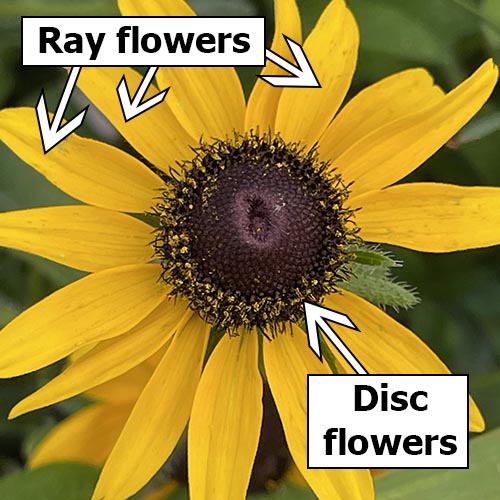 With black-eyed Susans, the bright yellow “petals” are actually sterile ray flowers whose sole purpose is to attract pollinators. Think of them as the big flashy billboard or sign. The brown center is made up of lots of individual flowers containing nectar and pollen. (They’re called disc flowers.) The disc flowers closest to the yellow ray flowers bloom first and the ones in the very center bloom last.
