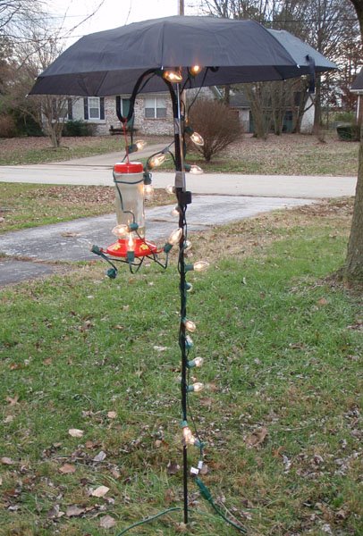 When we hosted our winter hummingbird, our neighbors thought we were insane. I raided Mom’s attic and pulled out some of the old Christmas lights – the big ones that got hot if you left them plugged in – and strung them up a shepherd’s pole and our hummingbird feeder to help keep the food from freezing. I also attached an umbrella above the feeder to try to give it a little more shelter from any precipitation while it was feeding.